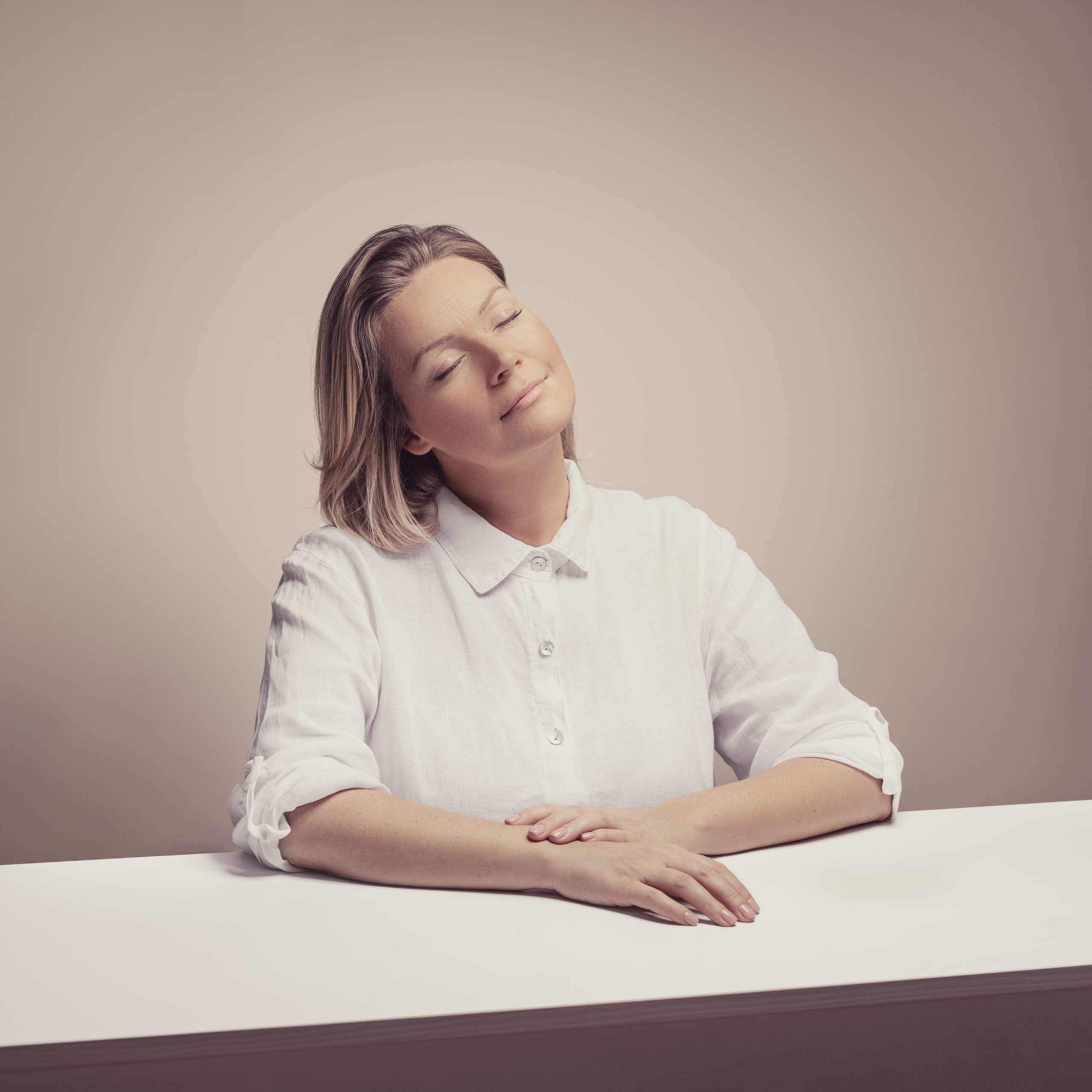 Valisime talle riidekapist selga võimalikult lihtsa pluusi. Et miski ei hakkaks võistlema puhta pilgu ja emotsiooniga, palusin tal isegi ülemise pluusinööbi kinni jätta. Võttepaigaks valisin väikese magamistoa seina, mille ees oleva kummuti eemale lükkasime ja nii sinna omale väikese stuudio tekitasime.